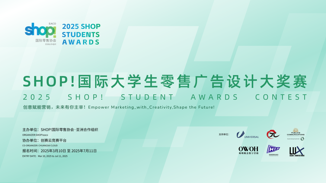 SHOP!国际大学生零售广告设计大奖赛由Shop国际协会主办,旨在激发大学生的创意潜能,提升广告专业学生的实际操作能力,推动广告教育改革,促进广告行业与高校的交流与合作。通过广告营销设计大赛和广告营销技能知识竞赛,培养大学生的创新意识和实践能力,提供一个展示自我、交流学习的平台,增强大学生的团队协作精神和社会责任感。并激发大学生的创意潜能,提升他们的实际操作能力,推动广告教育改革,促进广告行业与高校的交流与合作。
